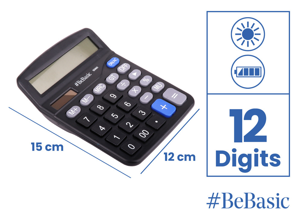 Αριθμομηχανή 12 ψηφίων της BeBasic με μεγάλα πλήκτρα, για εύκολη και γρήγορη πληκτρολόγηση, χωρίς λάθη.