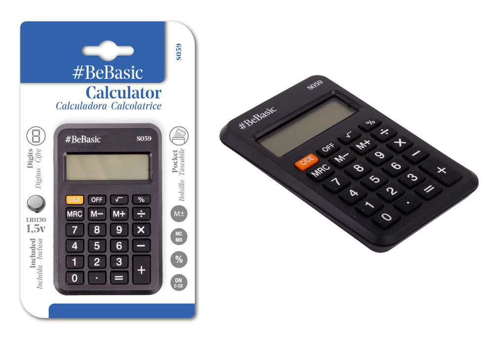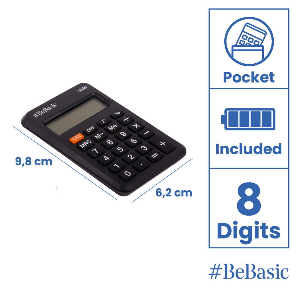 Πρακτική και εύχρηστη αριθμομηχανή τσέπης της BeBasic, ιδανική για καθημερινές πράξεις στο σχολείο, το γραφείο ή εν κινήσει.