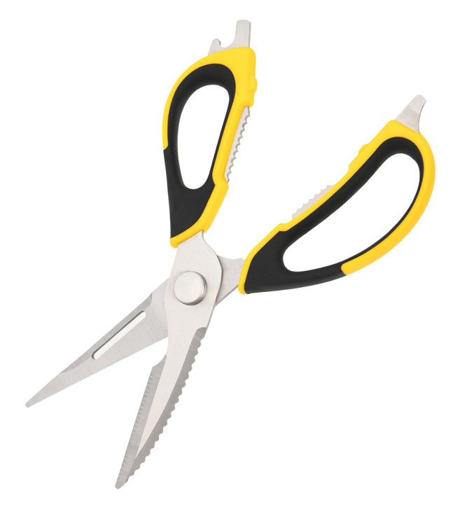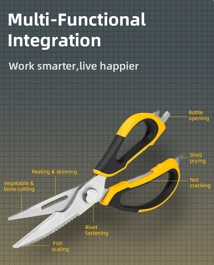 Ψαλίδι πολλαπλών χρήσεων της Deli, κατάλληλο για κοπή λαχανικών και οστών, ξεφλούδισμα, αλλά και για βοηθητικές λειτουργίες όπως άνοιγμα μπουκαλιών και σπάσιμο ξηρών καρπών. Η εργονομική, αντιολισθητική λαβή προσφέρει άνετο και ασφαλές κράτημα.