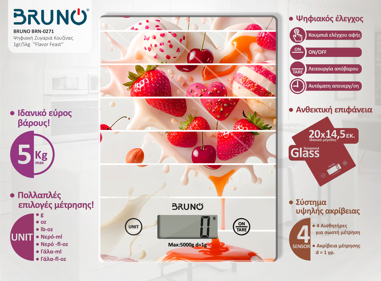 BRUNO ψηφιακή ζυγαριά κουζίνας BRN-0271, 1gr/5kg, Flavor Feast