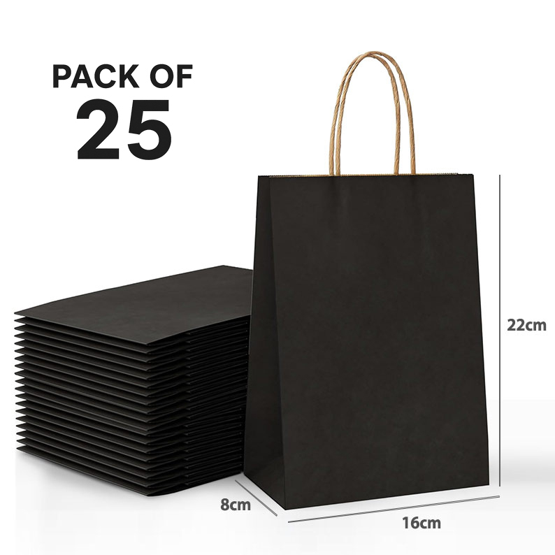 Χάρτινες σακούλες δώρου σε κομψό μαύρο χρώμα, κατασκευασμένες από ανθεκτικό χαρτί 120 g/m². Είναι 100% ανακυκλώσιμες και διαθέτουν πιστοποίηση FSC, εξασφαλίζοντας οικολογική και υπεύθυνη παραγωγή. Διατίθενται σε συσκευασία των 25 τεμαχίων. Ιδανικές για καταστήματα, δώρα, προωθητικές ενέργειες και εκδηλώσεις.