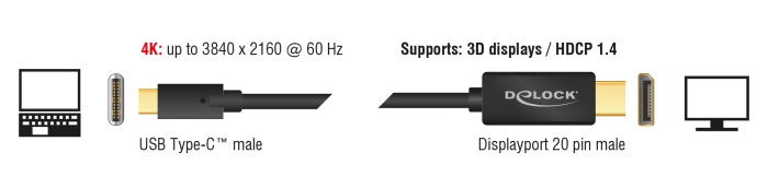 Αυτό το καλώδιο της Delock επιτρέπει τη σύνδεση μιας οθόνης με DisplayPort διεπαφή σε ένα PC ή laptop μέσω θύρας USB-C ή Thunderbolt 3. Η θύρα USB-C θα πρέπει να υποστηρίζει DisplayPort Alternate Mode.